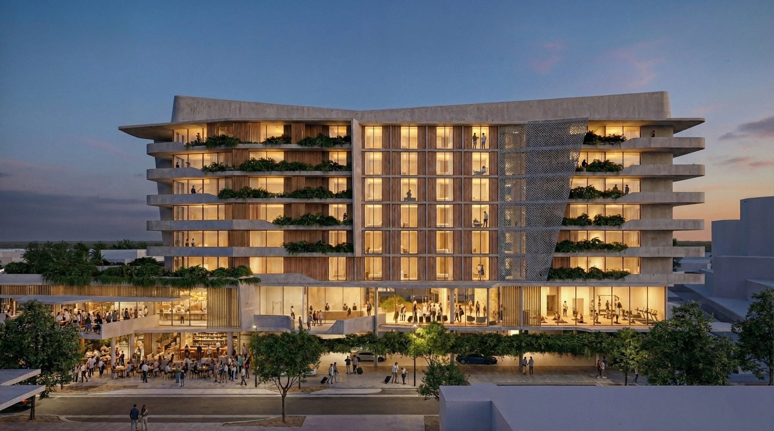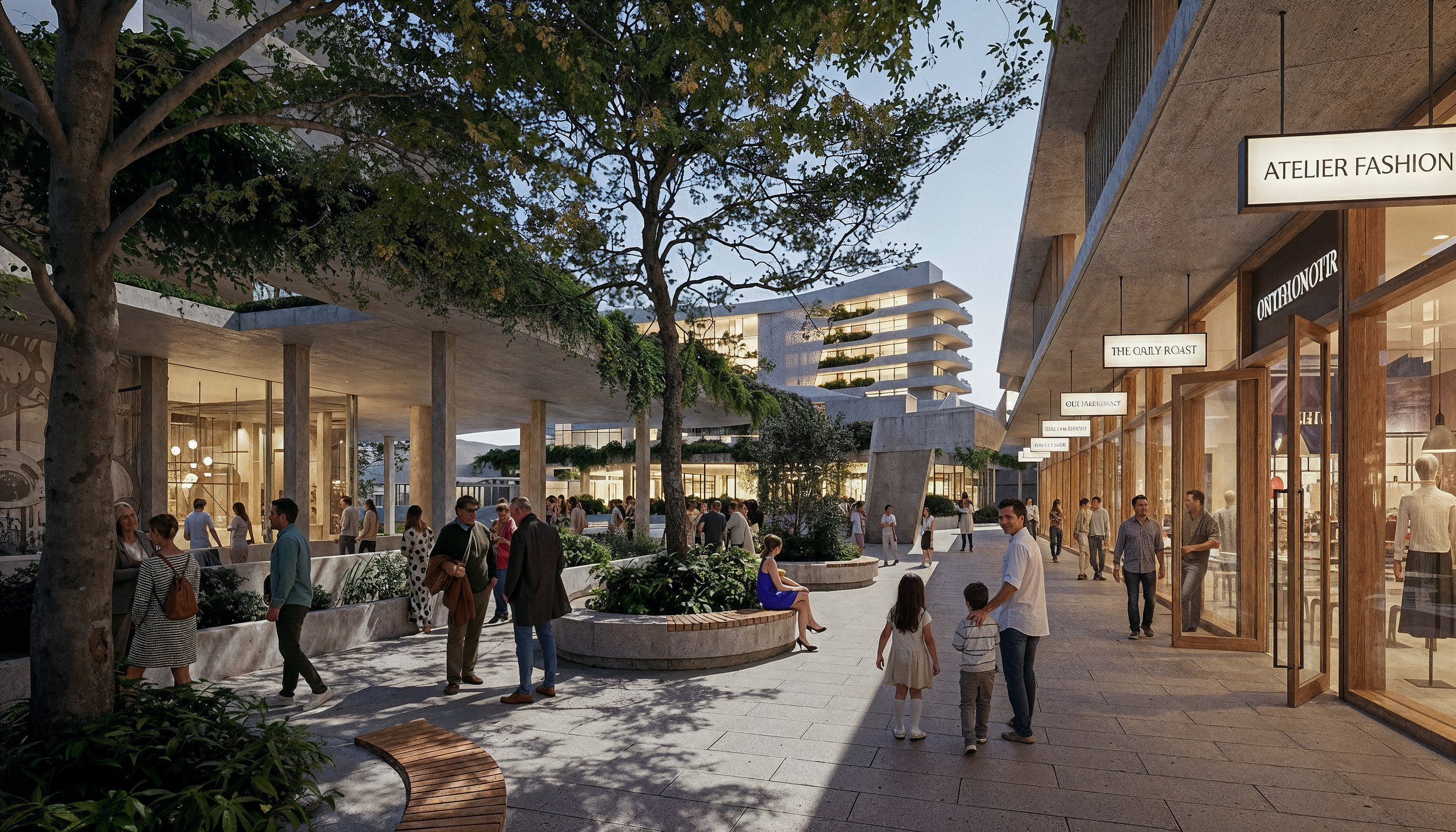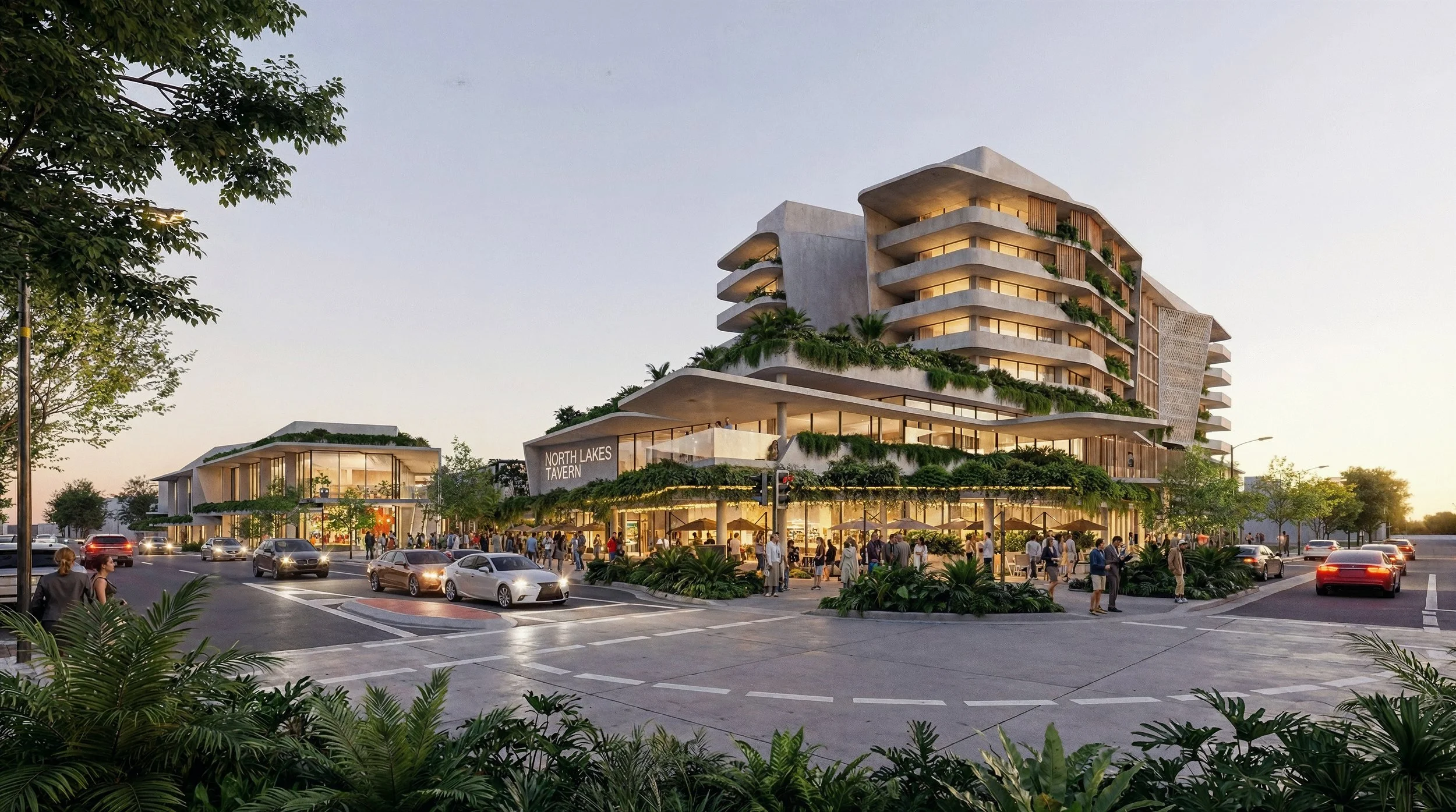 Designed to be a premier mixed-use precinct, our proposal for the North Lakes Town Centre seamlessly blends hospitality, retail, wellness, and commerce into a vibrant community hub. Defined by a modern subtropical aesthetic, the architectural scheme embraces the Queensland climate with cascading greenery, garden pavilions, and open-air terraces that connect distinct zones within the development.
