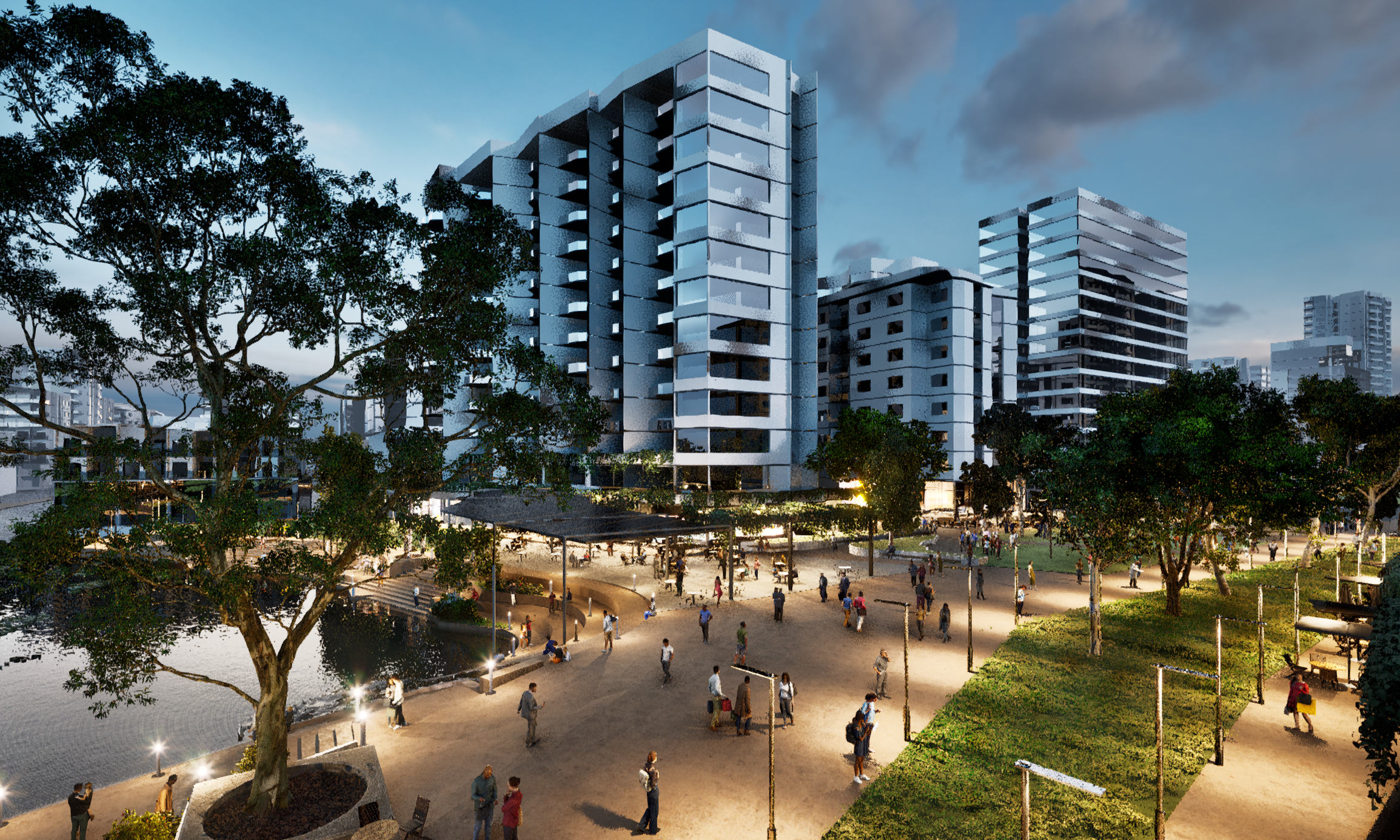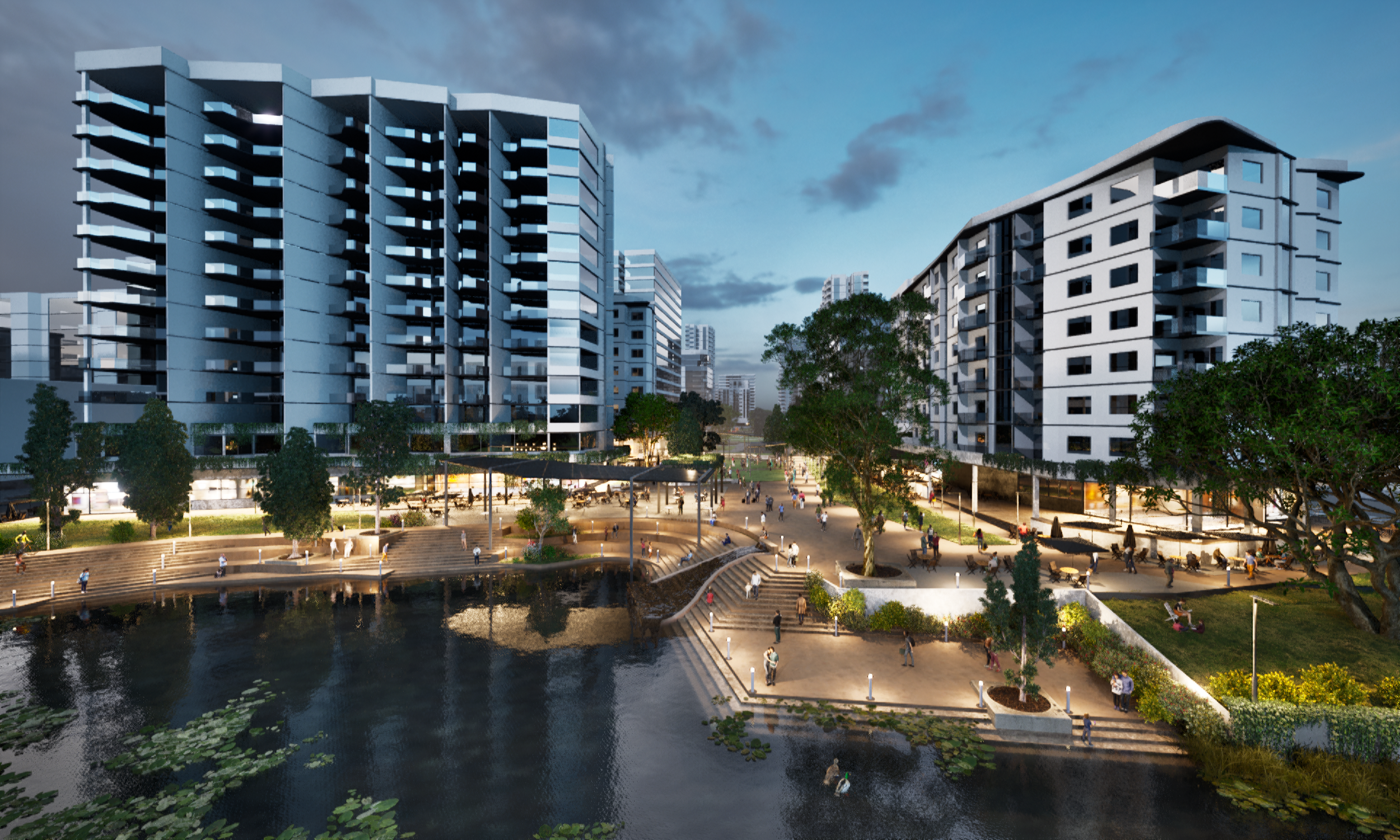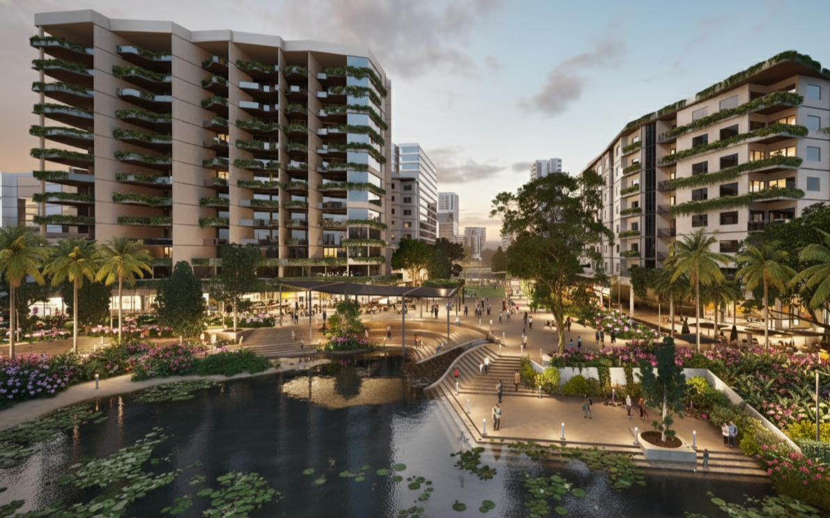 Centred on Kedron Brook's restored landscape, the proposal transforms a fragmented light-industrial corridor into a vibrant, walkable, mixed-use precinct. New medium- to high-density buildings are oriented to "face the creek," with boardwalk dining, creekside pavilions and active travel links weaving the waterway into everyday life. A reimagined high street, central park, swimming lagoons and upgraded community facilities complete the vision of a climate-responsive urban village — one that is connected, shaded, and designed for the subtropical climate it inhabits.